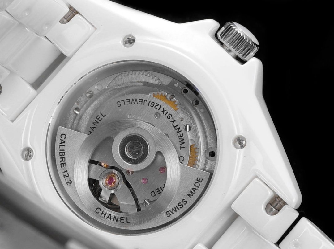 eight ⃣ The secret bottom has been transformed into a back through design, and through the bottom see through glass, the Chanel exclusive CALIBER12.2 automatic winding mechanical movement is fully visible, highlighting its value.