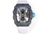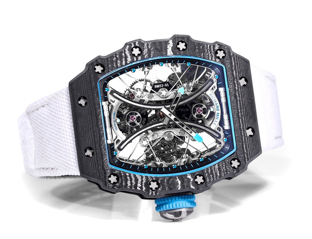 The RICHARD MILLE RM53-01 combines watch design with sports events, perfectly embodying the unwavering faith and tenacious spirit of heroes on the field. RM53-01 is based on equestrian sports and uses various high-tech materials to resist strong impacts during exercise, ensuring it operates normally without damage. High tech materials are crafted like protective gear. The tourbillon watch “RM 53-01 PABLO MAC DOOUGH” not only possesses the dynamic and energetic qualities of a sports watch, but also comes with a sturdy TPT ® The carbon fiber case, laminated sapphire crystal mirror, and suspended steel cable that fixes the movement effectively reduce the impact of huge shocks and accidental collisions on the watch, making it one of the most “resistant” luxury sports watches in the world. one ⃣ The case continues the classic barrel design, with high recognition and a diameter of approximately 51x43x16mm, using TPT ® The case is made of carbon fiber composite material, which is internationally recognized as the most outstanding composite material, TPT ® Carbon fiber is known for its excellent seismic resistance. Carbon fiber material ensures the hardness of the watch, is lightweight and earthquake resistant, highlights the sporty style, and has a unique texture that adds a distinctive ornamental value to the watch. The pattern is novel and beautiful. two ⃣ ️TPT ® The carbon fiber case is fixed with 20 grade 5 titanium alloy spline screws and 316L stainless steel washers, ensuring a waterproof performance of 50 meters. three ⃣ The mirror of this watch is also very sturdy. Ordinary mirror glass cannot withstand the impact of polo sticks. This watch uses a patented anti UV coating laminated sapphire crystal mirror, which prevents the mirror from breaking into pieces when subjected to strong impacts, only cracks appear. Even when facing strong impacts, the mirror will not shatter or splash, greatly avoiding damage to the movement and wearer. three ⃣ The upper hollow disk is made of titanium alloy, with blue fluorescent markings on the surrounding hour markers, which complement the blue fluorescent markings on the middle hour markers. Even in darker environments, time can be observed, making it very convenient. four ⃣ The back through bottom of the table presents the entire fishing system to the public in a clear view. The bridge has a groundbreaking double bottom plate structure, consisting of a first “central” bottom plate that firmly fixes different movement gears together, and an “outer edge” bottom plate that is attached to the central bottom plate through steel cables to support the entire tension system. The suspended steel cable movement is divided into two parts, with the outer part consisting of steel cables and pulleys, and the inner part consisting of a “suspended” tourbillon movement. Enhanced the rigidity of the watch while ensuring smooth operation of the gear system and providing optimal impact protection.