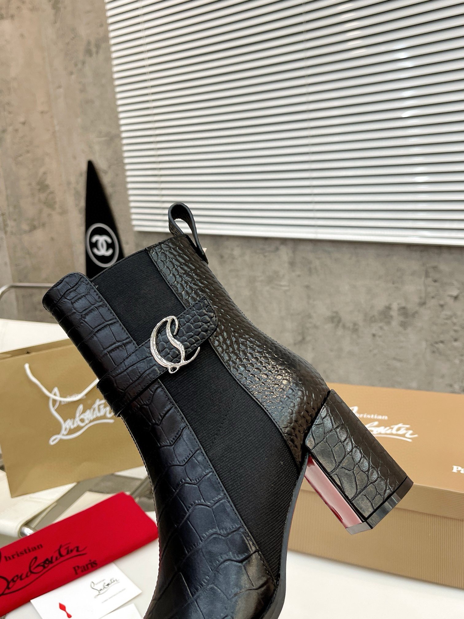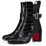 The CL Chelsea Booty boot showcases clean lines and timeless elegance. With its almond shape and elastic insert on the side, it is crafted in alligator-effect embossed calf leather. Set on a 70 mm heel, it has a strap with a silver metal CL monogram. This urban style features a heel tab adorned with a Maison Christian Louboutin signature silver spike.