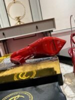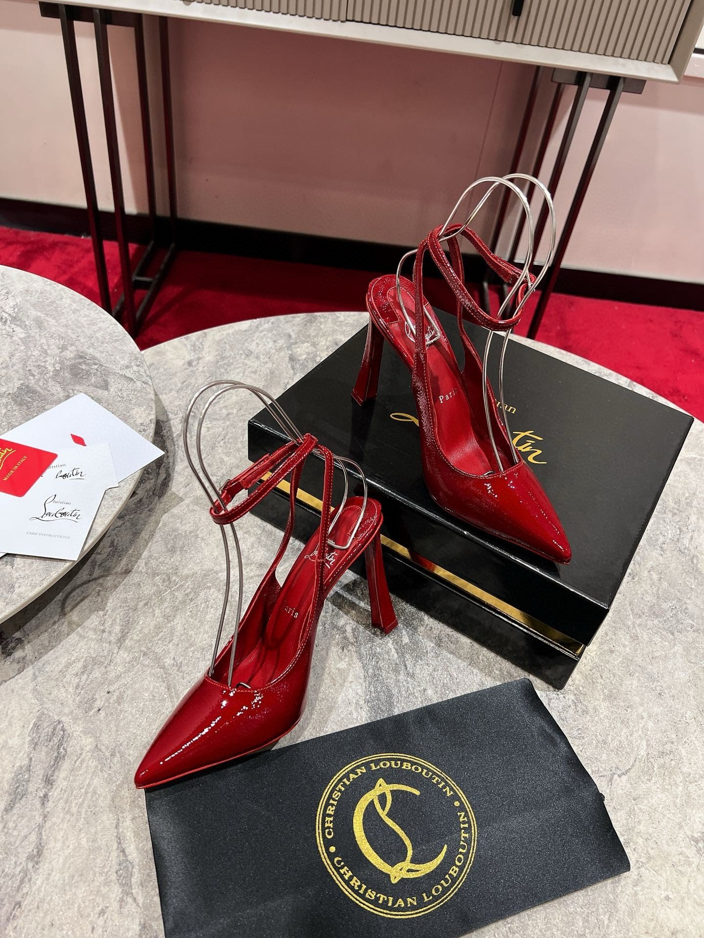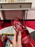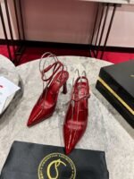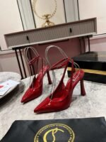 The Condora Strap pump has a pointed toe reminiscent of a bird’s beak. This sophisticated style in Loubi red patent calf leather features an audacious vamp revealing the foot. It is distinguished by a 100 mm bevelled heel, showcasing Maison Christian Louboutin’s innovative creativity. The delicate, slender ankle strap evokes elegance. The “Vog patent leather” material, being more flexible, offers better suppleness. Its wrinkled effect may have slight variations between the photo and the product.