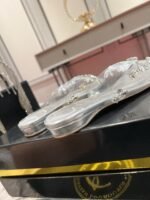 A new twist on the Degrasstrass pump, the Degraqueenie mule features a very slight heel, transparent PVC upper, and elegant open toe. As part of the Strass Up collection, this modern model is adorned with Maison Christian Louboutin’s latest take on jewels and strass – bigger, bolder crystals, each handsewn onto the PVC upper. The heel and lining are crafted in silver nappa laminata leather.