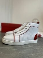 The Fun Louis Woman high-top sneaker is inspired by the world of basketball and mounted on a white rubber sole. The upper of this iconic model skilfully marries white perforated leather and Loubi red iridescent patent calfskin in a combination of elegant and sporty lines. Accented by delicate finishes, the counter is also adorned with the creator’s signature and a badge bearing his name.