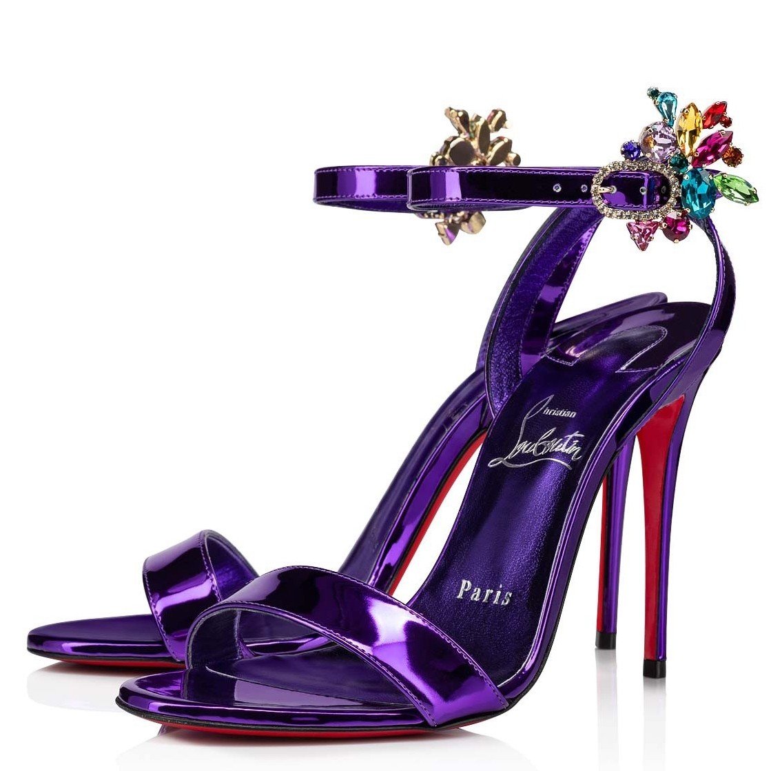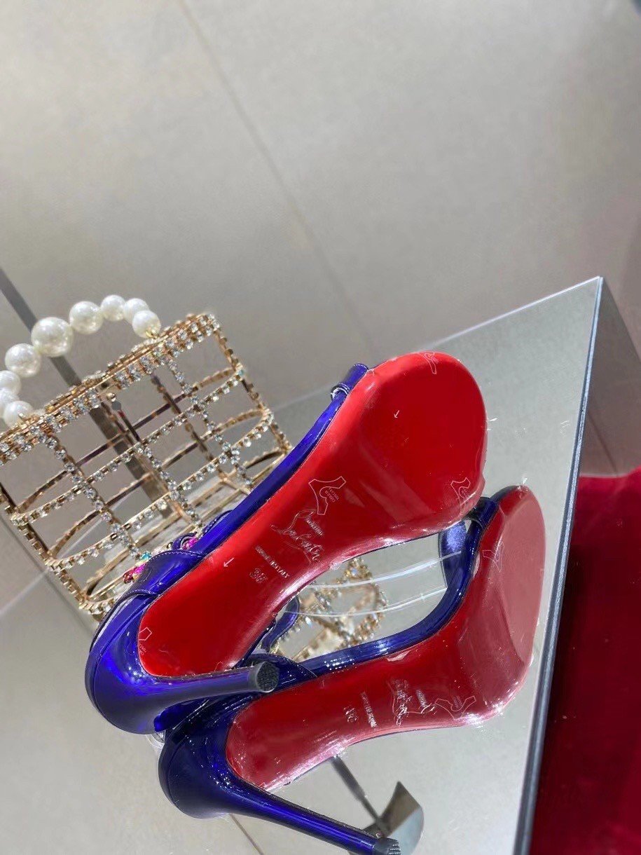 The Goldie Joli sandal is a refined shoe distinguished by its elegance and minimalist style. This Maison Christian Louboutin shoe is set on a 100 mm heel and features an Elektra blue mirror-effect finish. It has a crossed strap at the back which delicately envelops the ankle. The buckle is set with silver and multicolored rhinestones, creating a scintillating effect.