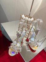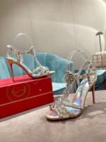 The Goldora is a T-strap sandal inspired by the iconic Kaleikita model from SS17. This show-stopping 100 mm stiletto sandal is built on a wide sandal/Kate last for wearability, while the almond-shaped/pointy toe box perfectly frames the foot. Once again, Mr. Louboutin deftly combines simplicity, elegance and drama in the upper, crafted from silver-tone and aurora borealis effect Patent Psychic leather, with foot and heel straps embellished with a mix of spikes.