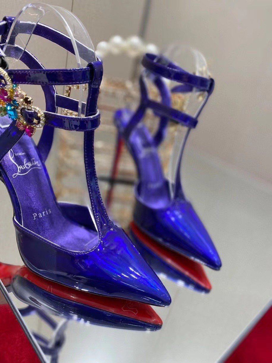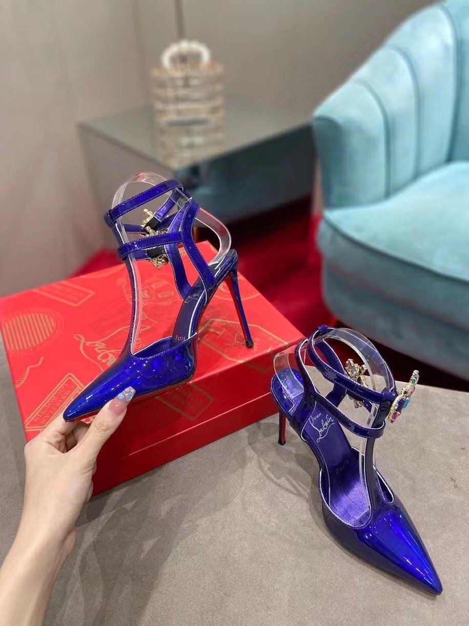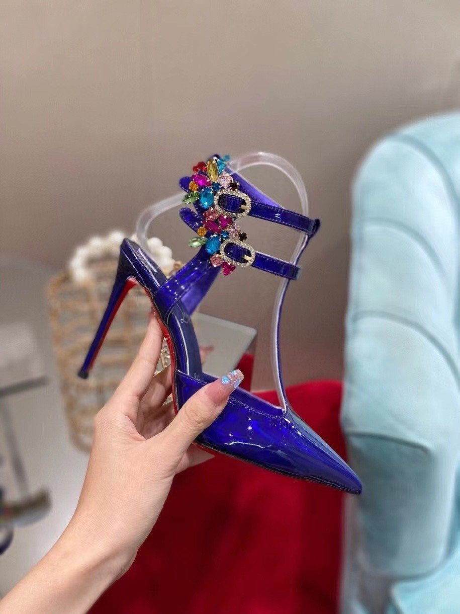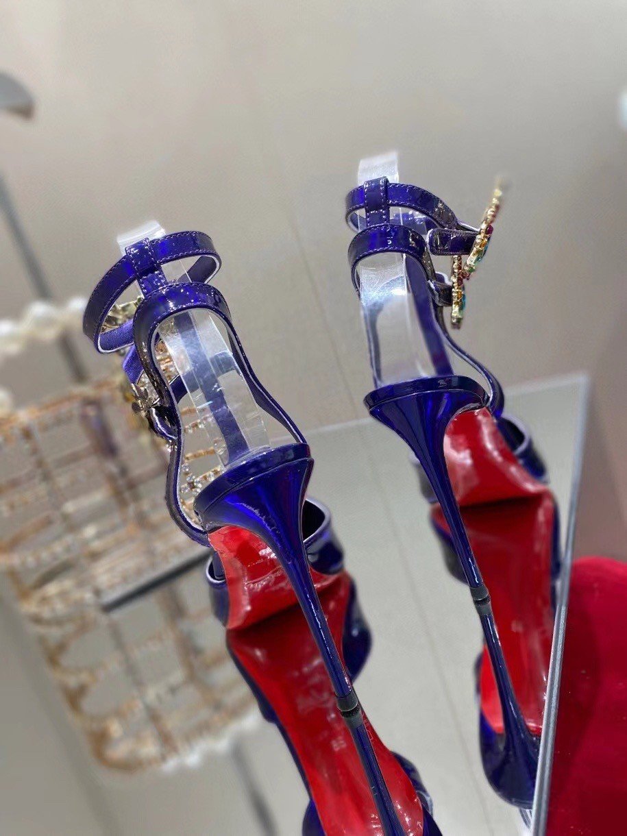 The elegant and stylish Maravilla pump has an irresistibly sophisticated look. This Maison Christian Louboutin shoe is set on a 100 mm heel and is designed in Elektra blue mirror-effect leather. It has two adjustable straps set with silver buckles and multicolored strass that delicately encircle the ankle.