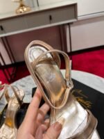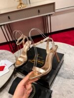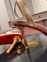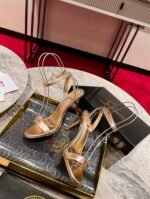 The Mascasandal features an 85 mm jewel-like heel inspired by Maison Christian Louboutin’s mascara case, crafted in the image of ancient columns with a gold finish. The sandal’s sleek, elegant design, with slim straps across the toe and around the ankle, shows off the heel in its full splendor. This model is crafted in Leche beige laminated leather.