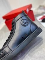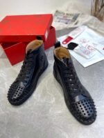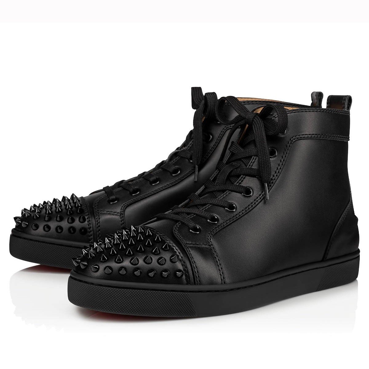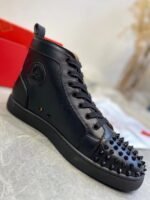 The Lou spikes is a classic 1980’s inspired Hi-top sneaker – a reworked version of the iconic Louis with the addition of Maison Christian Louboutin’s audacious signature spikes evenly hand-placed across the toe. This sophisticated model is crafted in Black calfskin leather and features black laces, soles and edging; even the iconic spikes across the toe are Black, creating an understated effect.