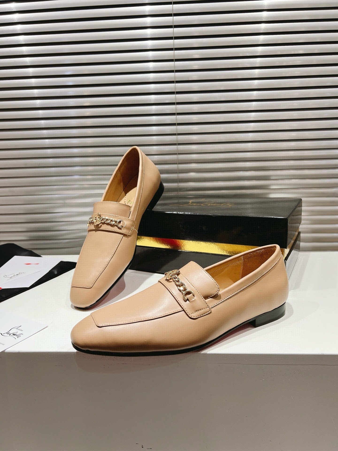 The men’s MJ Moc loafer is crafted in calf leather, and stands out for its sacchetto construction, a complex assembly technique performed by certain artisans, which ensures maximum flexibility for the shoe. This shoe from Christian Louboutin features a square toe. Its sophisticated lines are highlighted by topstitching and a gold chain on the top with the CL monogram. This pair has a slightly shiny finish in soft leather with a supple, second-skin feel.