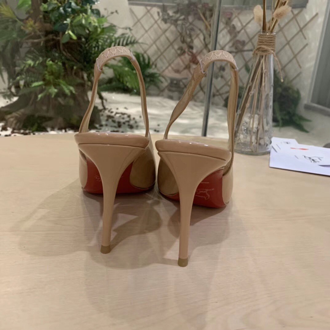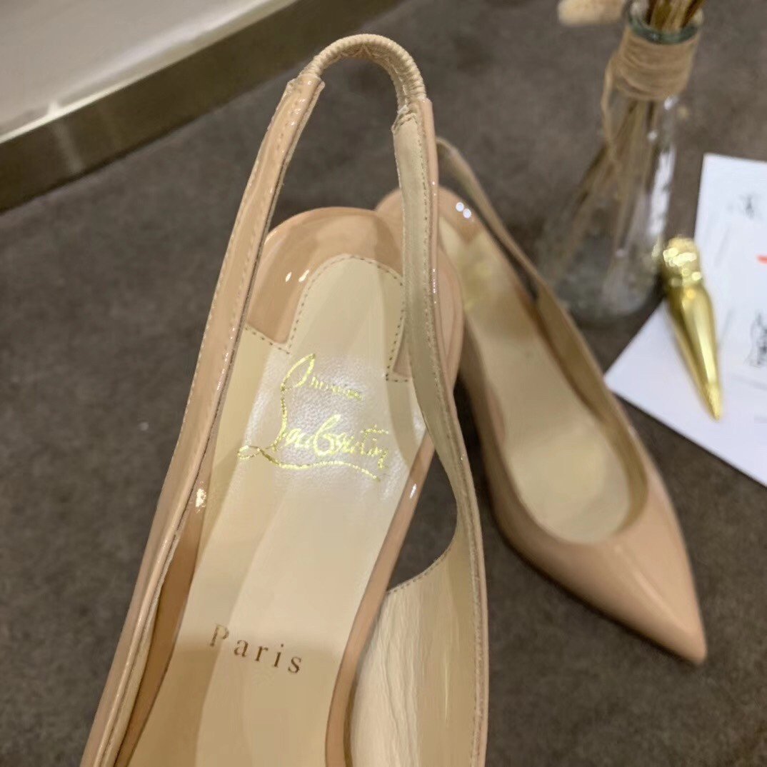 The Clare Sling pointy-toe pump is covered in glossy patent leather and adjusts with an elastic slingback strap on an 80mm stiletto heel. Its low-cut décolleté reveals with modernity, the expertise of the Louboutin House.