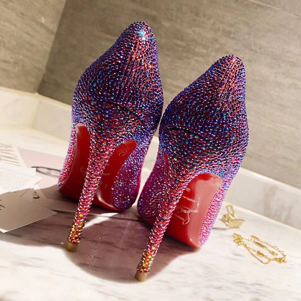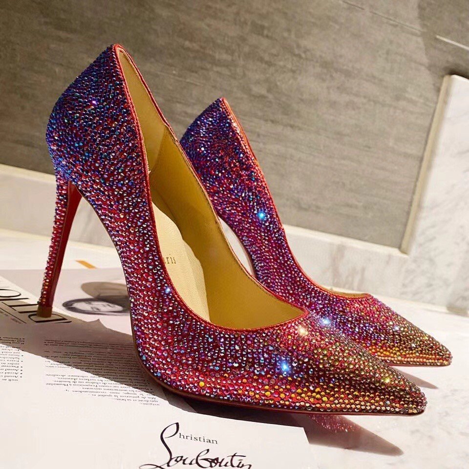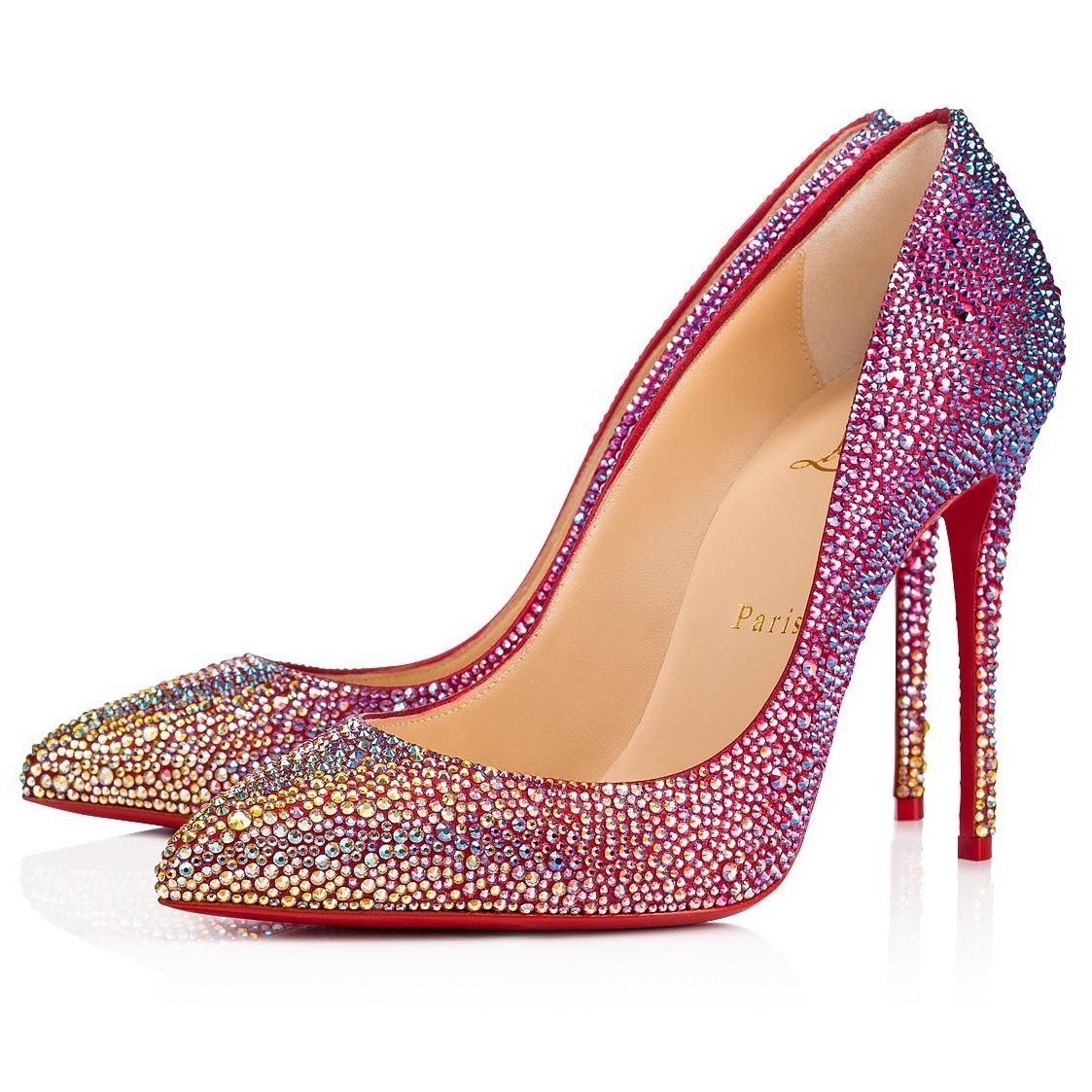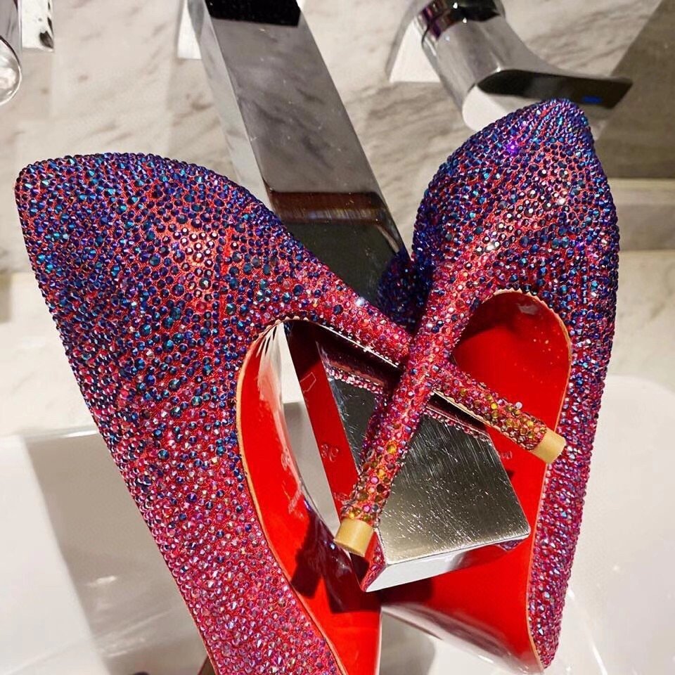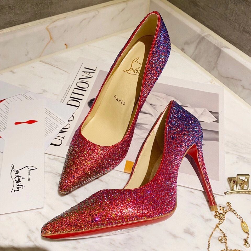 An iconic model, the Kate pump is cloaked in Red Veau Velours with hand-placed strass from toe to tip highlighting its elegant curves. Mounted on a 100mm heel, it raises the slender silhouette with accuracy, revealing with each step the savoir-faire of the Maison Christian Louboutin.