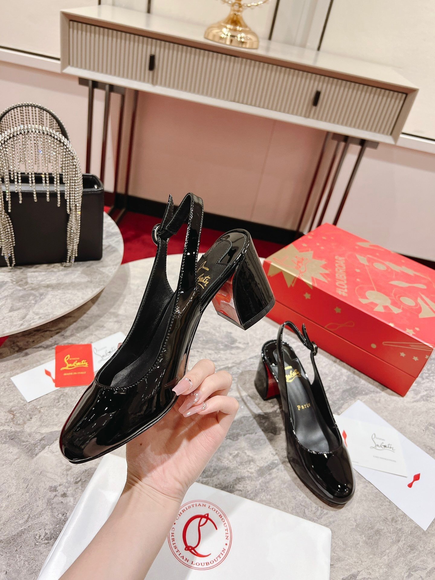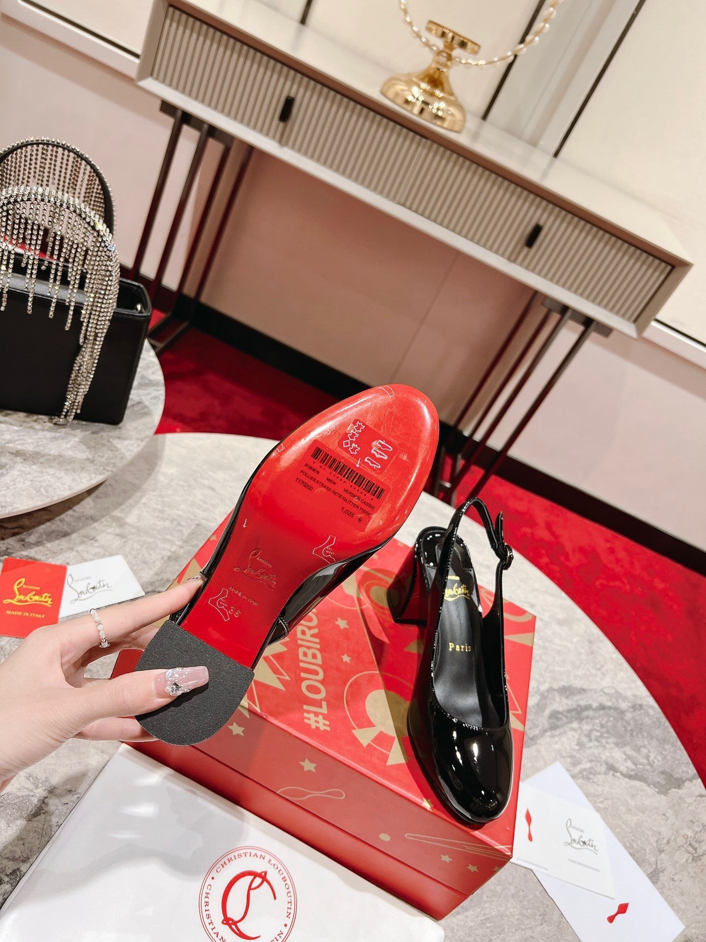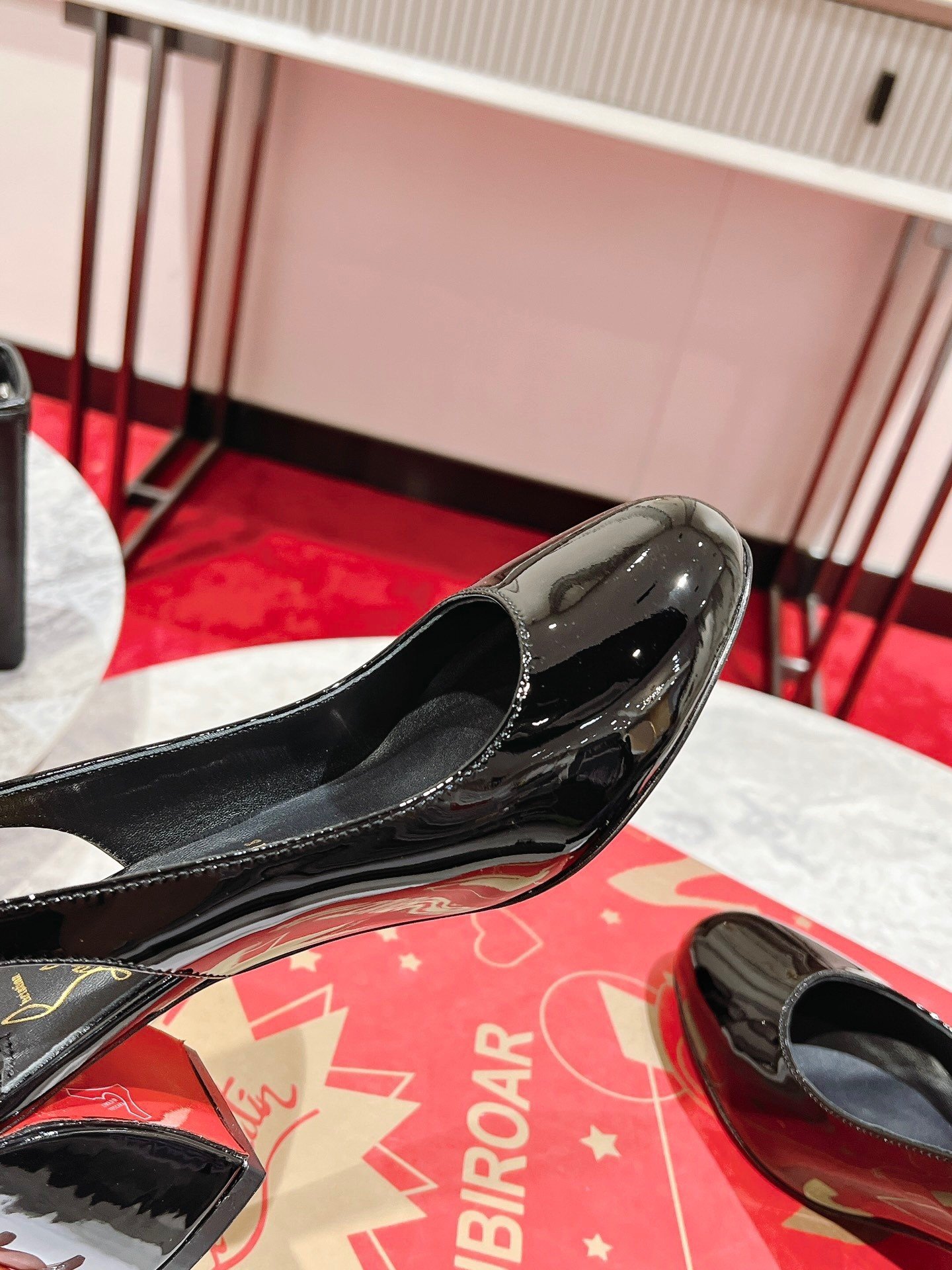 The timeless So Jane Sling pump enchants with sleek lines. This Maison Christian Louboutin slingback is crafted in patent calf leather. It features a strap with a round tonal clasp on the side. This model reveals a low-cut vamp and is enhanced with a 55 cm slanted heel.