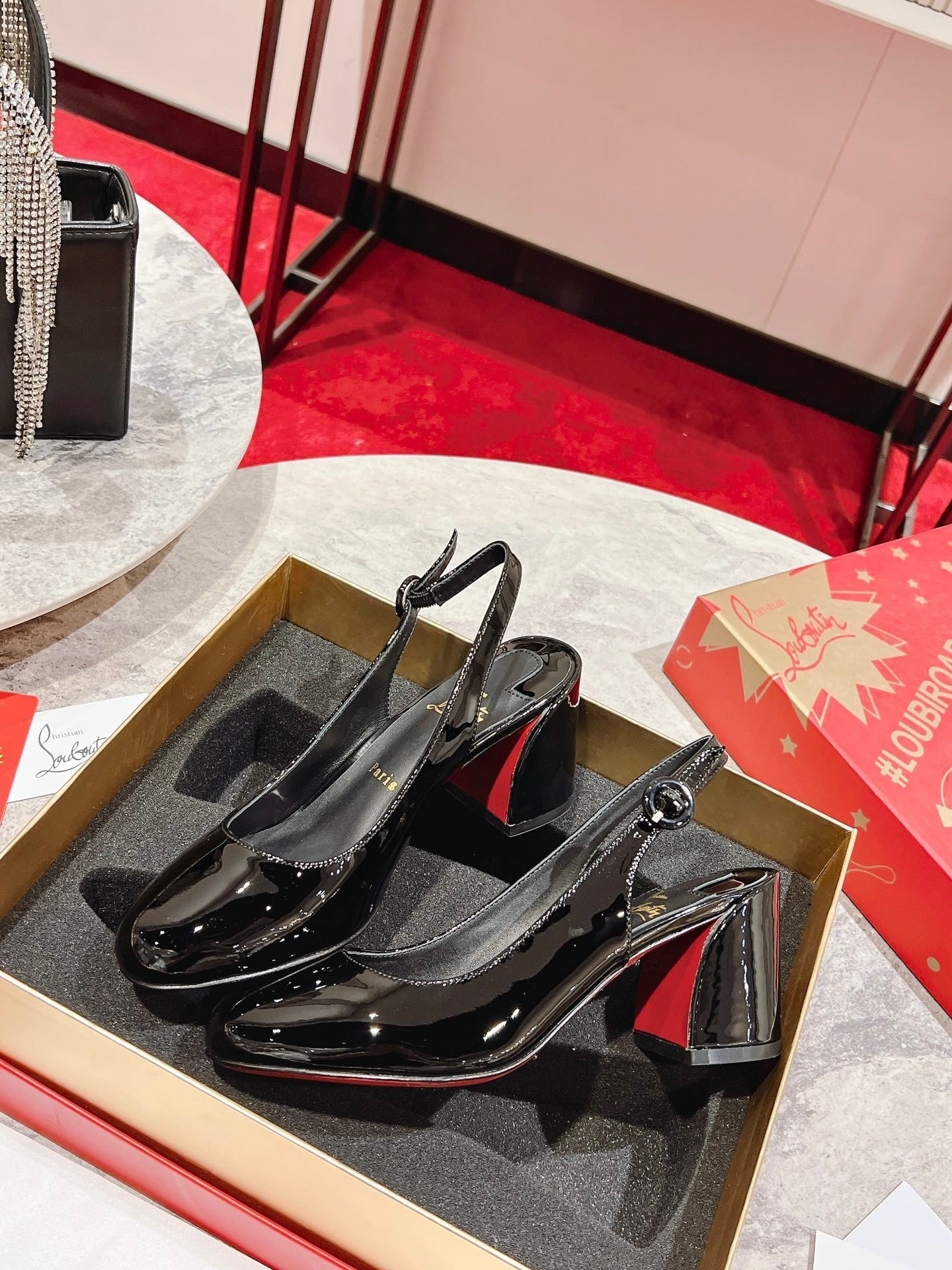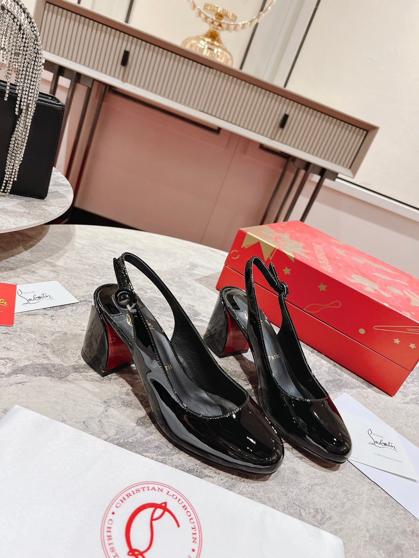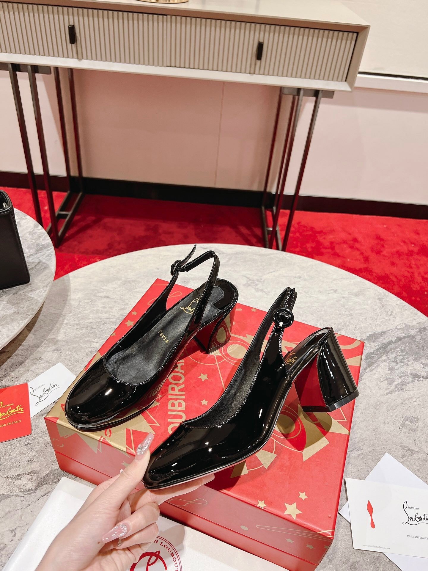 The timeless So Jane Sling pump enchants with sleek lines. This Maison Christian Louboutin slingback is crafted in patent calf leather. It features a strap with a round tonal clasp on the side. This model reveals a low-cut vamp and is enhanced with a 55 cm slanted heel.