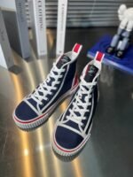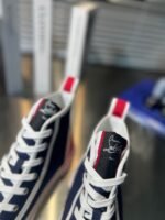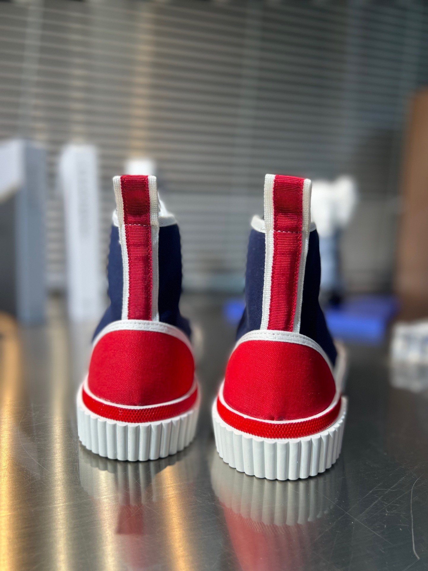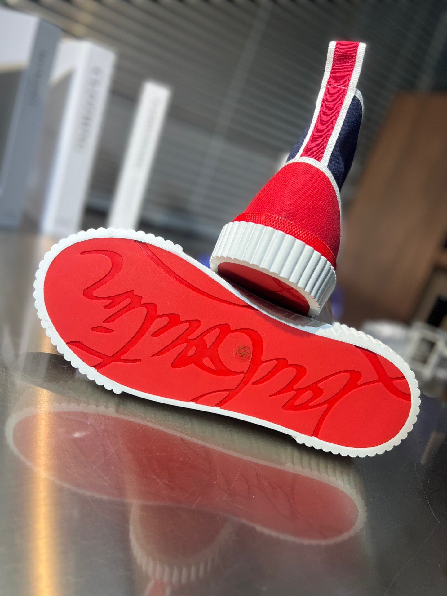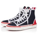 The timeless Pedro high-top sneaker is an enchanting summer style. This model has a two-color heel tab and is crafted in navy blue cotton. The white textured rubber sole is enhanced with signature red edging and embossed with a CL monogram The Maison Christian Louboutin logo appears on a contrasting label on the tongue.