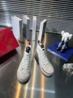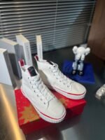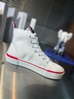 The timeless Pedro high-top sneaker is an enchanting summer style. This model has a two-color heel tab and is crafted in white cotton. The white textured rubber sole is enhanced with signature red edging and embossed with a CL monogram The Maison Christian Louboutin logo appears on a contrasting label on the tongue.