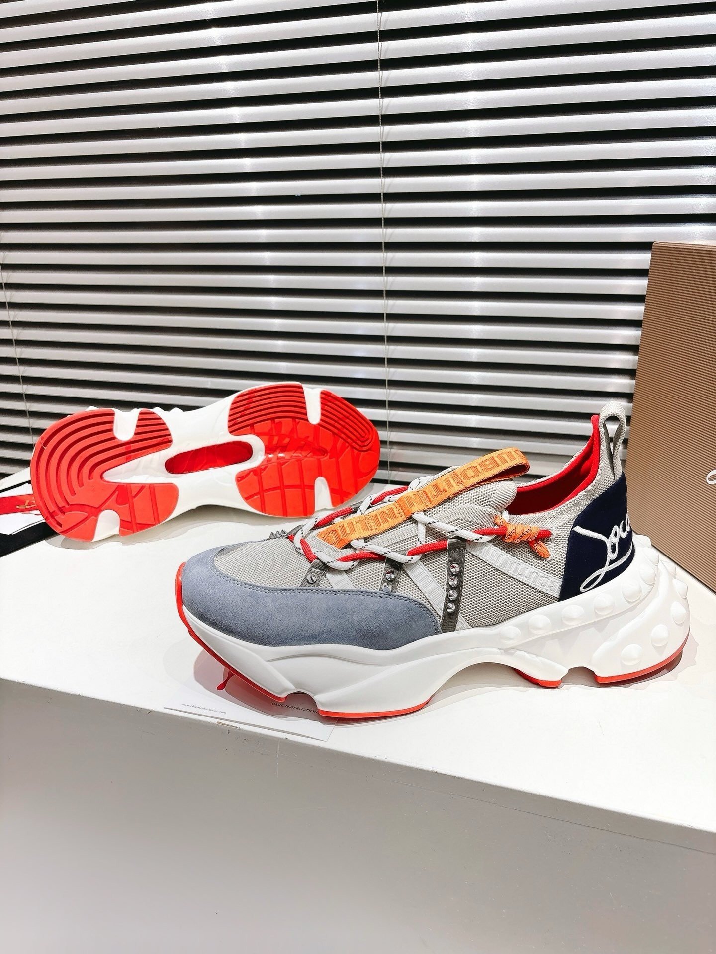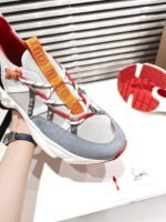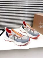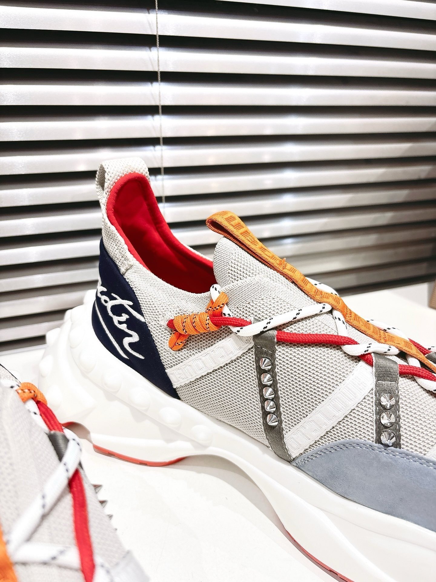 Inspired by the world of trail running, the Trailnrun sneaker plays with a mix of textures. Crafted from suede, calf leather, mesh and neoprene, this pair features a heel tab with the Christian Louboutin signature on the tip. It is distinguished by its technical features, such as the lightweight two-tone sole and anatomical heel. This shoe is embellished with tonal signature spikes and reflective laces.