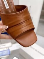 These Manolo Blahnik Picoux 70 leather sandals are made softe nappa leather. They feature a slip-on style, open toes, a ruched front strap and a gold tone 70mm flared heel. Manolo once said, ‘You put high heels on and you change.’ And with these Manolo Blahnik sandals, we can already feel ourselves changing for the good.