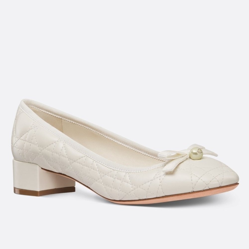 The Dior Ballet pump revisits a timeless pattern with elements of House couture. Crafted in quilted calfskin with the Cannage motif, it is distinguished by a delicate grosgrain bow on the front adorned with a white CD resin pearl inspired by the iconic Dior Tribales earrings. Featuring a padded leather insole and 3 cm block heel, the comfortable pump will add the finishing touch to all of the season’s looks.