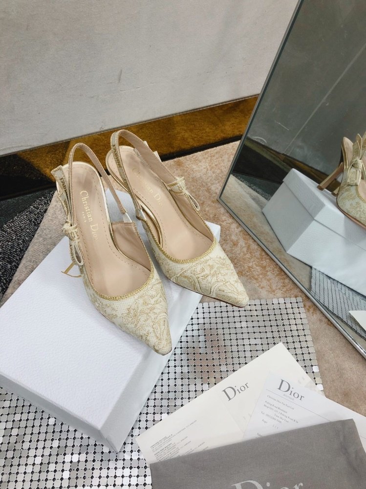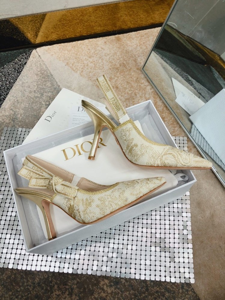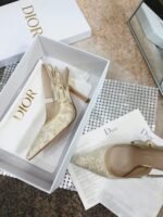 The J’Adior slingback pump is a prime example of Dior’s savoir-faire. The luminous style is crafted in cotton embroidered with metallic thread, showcasing the white and gold-tone Toile de Jouy motif. The two-tone ‘J’ADIOR’ signature on the embroidered cotton ribbon, bow and 10 cm comma heel complete this refined and elegant style. The pump will pair well with the collection’s other Toile de Jouy creations.