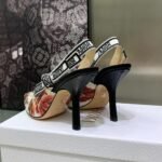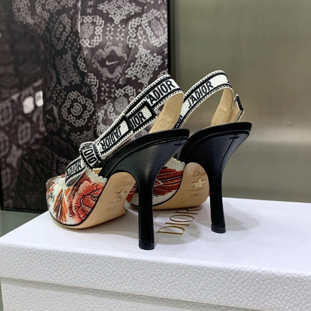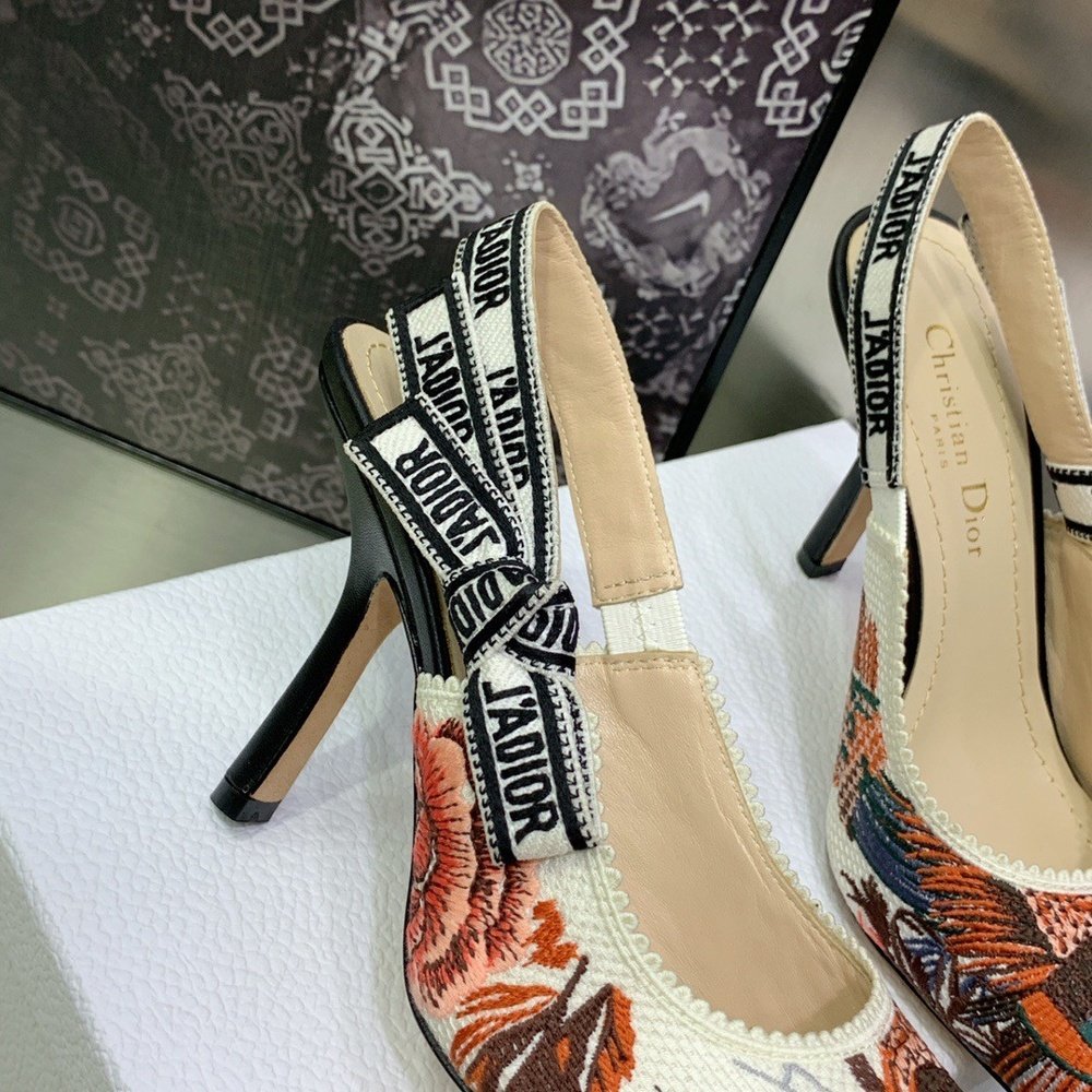 The J’Adior slingback pump is a prime example of the House’s savoir-faire. The style showcases the white multicolor Dior Jardin d’Hiver motif, offering a poetic and exotic iteration of Mr. Dior’s wall tapestries. The two-tone ‘J’ADIOR’ signature on the embroidered cotton ribbon, the bow and the 10 cm comma heel complete the elegant and refined creation.