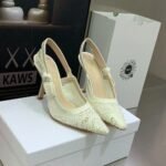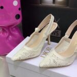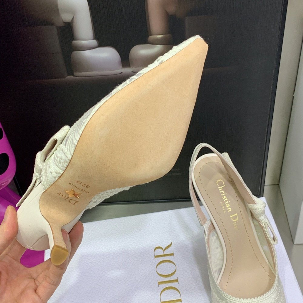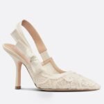 The J’Adior slingback pump is a prime example of Dior savoir-faire. The embroidered cotton design is enhanced by a white macramé motif in an elegant play on transparency. The ‘J’ADIOR’ embroidered ribbon, the bow and 10 cm (4) comma heel complete the refined and elegant creation.